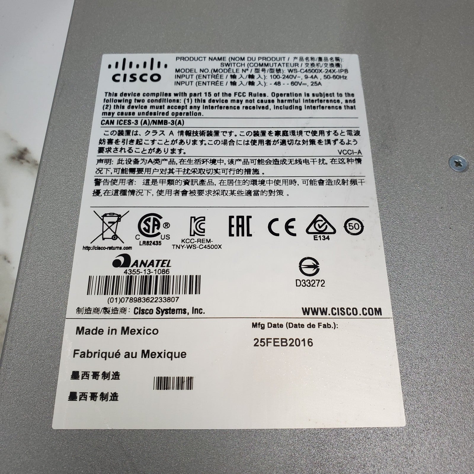 • Model: Cisco WS-C4500X-24X-IPB 24 Port 10GE IP Base 4500-X Switch